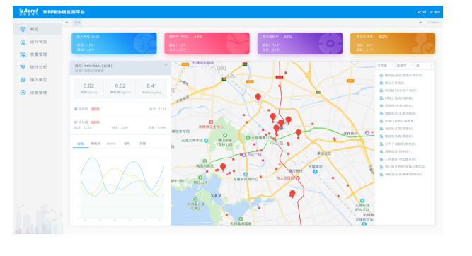 對(duì)油煙排污數(shù)據(jù)的監(jiān)測(cè),包括油煙排放濃度,顆粒物,NmHc等數(shù)值采集監(jiān)測(cè);同時(shí)對(duì)監(jiān)控風(fēng)機(jī)和凈化器的啟停狀態(tài)、運(yùn)行數(shù)據(jù)進(jìn)行監(jiān)測(cè)。