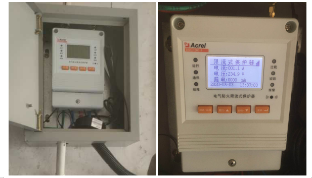 現(xiàn)場采用壁掛式的安裝方式,將保護器安裝在安裝箱中,然后通過安裝箱的開孔將保護器接入到配電線路中,然后從保護器中年將出線引出到末端回路,將與保護器配套的傳感器安裝在相應的位置,完成電氣防火限流式保護器的安裝,現(xiàn)場安裝圖片如下: