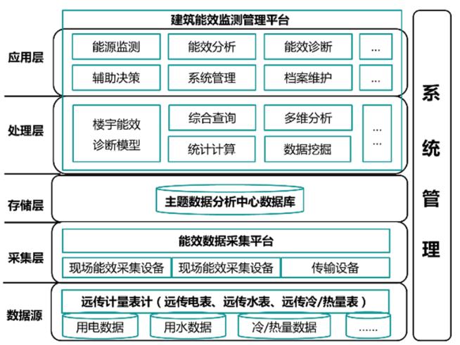 如圖1所示,綜合能耗監(jiān)測(cè)系統(tǒng)框架包括功能應(yīng)用層、邏輯處理層、數(shù)據(jù)存儲(chǔ)層、數(shù)據(jù)采集層、數(shù)據(jù)源五層架構(gòu)。其中,功能應(yīng)用層包括能源監(jiān)測(cè)、能效分析、能效診斷、輔助決策以及檔案維護(hù)、系統(tǒng)管理等用戶功能,通過(guò)多維度、可視化的系統(tǒng)功能界面實(shí)現(xiàn)與用戶的信息互動(dòng);邏輯處理層通過(guò)建立能耗評(píng)估模型,并利用數(shù)據(jù)挖掘、統(tǒng)計(jì)計(jì)算、多維分析等手段對(duì)能耗數(shù)據(jù)進(jìn)行分析,為功能應(yīng)用層提供直接的數(shù)據(jù)支持;數(shù)據(jù)存儲(chǔ)層利用主流結(jié)構(gòu)化數(shù)據(jù)庫(kù)對(duì)能耗數(shù)據(jù)進(jìn)行分類存儲(chǔ),提高邏輯處理層的處理性能;數(shù)據(jù)采集層利用終端采集設(shè)備實(shí)現(xiàn)對(duì)智能電表、智能水表和智能冷熱計(jì)量表等遠(yuǎn)傳終端的數(shù)據(jù)源采集,為整個(gè)綜合能耗監(jiān)測(cè)系統(tǒng)提供基礎(chǔ)數(shù)據(jù)支撐。
