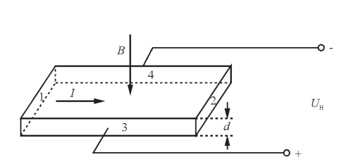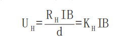 式中:RH是霍爾系數(shù)(是由材料性質(zhì)決定的一個(gè)常數(shù)),對(duì)于金屬導(dǎo)體而言,RH=1/nq(n為載流子濃度或自由電子濃度,q為電子電量。),I為通過(guò)器件的電流,B為垂直于I的磁感應(yīng)強(qiáng)度,d為導(dǎo)體的厚度,KH=RH/d稱為霍爾元件的靈敏度,它是表征單位磁感應(yīng)強(qiáng)度和單位電流時(shí)的霍爾電壓輸出大小的一個(gè)重要參數(shù),一般希望它越大越好。若保證式(1)中I不變,那么,在一定條件下,就可通過(guò)測(cè)量霍爾電壓UH來(lái)推算出磁感應(yīng)強(qiáng)度B的大小,并由此建立了磁場(chǎng)與電壓信號(hào)的聯(lián)系。根據(jù)這一關(guān)系,人們研制出了霍爾器件。