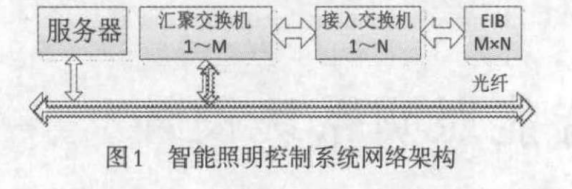系統(tǒng)的組網(wǎng)采用支/干線模式,其中的支線連接由KNX控制總線完成,干線連接依托館所現(xiàn)有局域網(wǎng)實現(xiàn),該局域網(wǎng)連通館內(nèi)全部控制器,不用另行敷設(shè)電纜和重復(fù)定義系統(tǒng)管控方式。依托KNX/IP網(wǎng)關(guān)優(yōu)勢就能夠方便地實現(xiàn)將本系統(tǒng)接入校園主干網(wǎng),實現(xiàn)遠(yuǎn)程的服務(wù)器連網(wǎng)。智能照明控制系統(tǒng)網(wǎng)絡(luò)架構(gòu)如圖1所示。