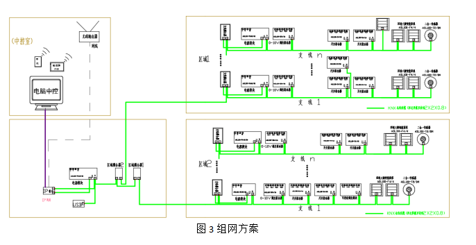 智能照明控制系統(tǒng)組網(wǎng)方式靈活,擴(kuò)展方便,當(dāng)系統(tǒng)模塊數(shù)量較少、距離較近、范圍較小時,各設(shè)備以樹形枝狀延伸,構(gòu)成支路系統(tǒng)智能照明控制系統(tǒng);當(dāng)系統(tǒng)模塊數(shù)量較多、距離較遠(yuǎn)、范圍較大時,用支線耦合器組成多條支路,構(gòu)成區(qū)域智能照明控制系統(tǒng);當(dāng)系統(tǒng)模塊數(shù)量很多、距離很遠(yuǎn)、范圍很大時,用支線耦合器、區(qū)域耦合器等構(gòu)成樓群智能照明控制系統(tǒng)。(見圖)