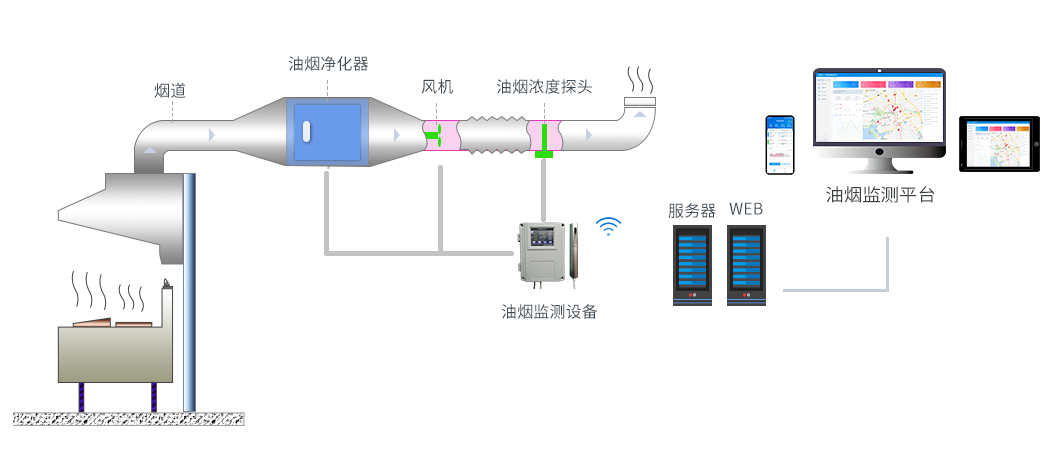 對(duì)油煙排污數(shù)據(jù)的監(jiān)測(cè),包括油煙排放濃度,顆粒物,NmHc等數(shù)值采集監(jiān)測(cè);同時(shí)對(duì)監(jiān)控風(fēng)機(jī)和凈化器的啟停狀態(tài)、運(yùn)行數(shù)據(jù)進(jìn)行監(jiān)測(cè)。