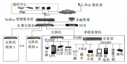 微模塊數(shù)據(jù)中心的機(jī)房管理采用 NetEco 基礎(chǔ)設(shè)施管理系統(tǒng),此系統(tǒng)由管理軟件和其他部件構(gòu)成,實(shí)現(xiàn)了對(duì)數(shù)據(jù)中心的溫濕度、空調(diào)系統(tǒng)、供配電系 統(tǒng)、UPS 后備電源、消防及監(jiān)控等多系統(tǒng)的數(shù)據(jù)采集與監(jiān)控,將各子系統(tǒng)和分散環(huán)節(jié)集中統(tǒng)一管理,為智 能化微模塊數(shù)據(jù)中心的全系統(tǒng)監(jiān)控提供了可靠保 障。NetEco 管理系統(tǒng)架構(gòu)圖如圖 3 所示。